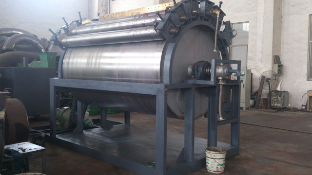 滾動刮板干燥機由主滾筒、機架、加料裝置(上部加料或下部浸料)、驅動機構、螺旋送料裝置、吸塵裝置、刮刀裝置等部件組成。